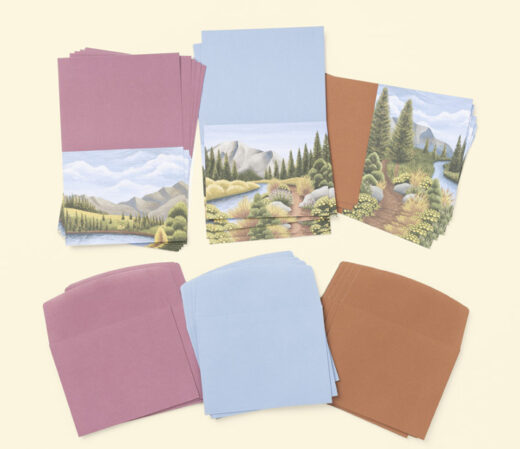 Besides a 7 piece all-occasion stamp set, you’ll get enough supplies to complete 9 cards with coordinating envelopes. 3 each of 3 different designs and a Copper Clay Stampin’ Spot!