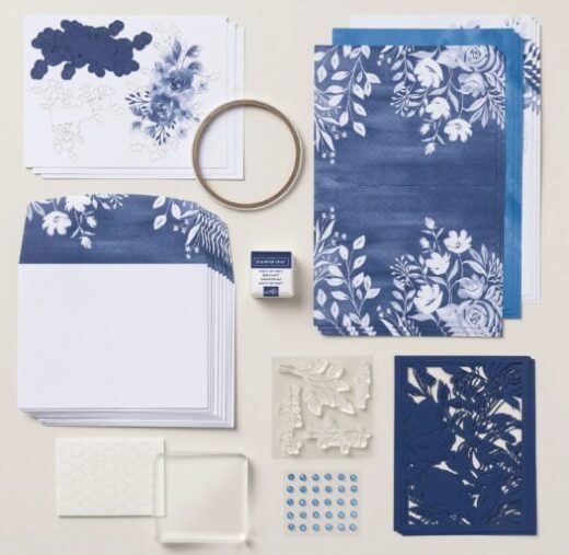 Perfect for anyone who likes blue! And even if they don’t like blue! It makes a great gift for a beginning crafter because it includes an acrylic block for the stamps and adhesives so they can make these anywhere!