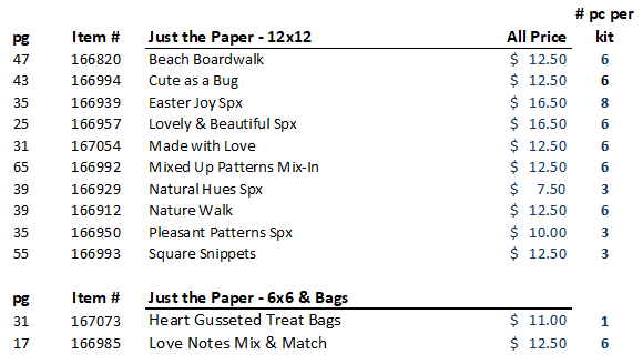 60 pieces of ready to use 4″ x 6″ pieces of all the 12″x12″ DSP, some die cuts